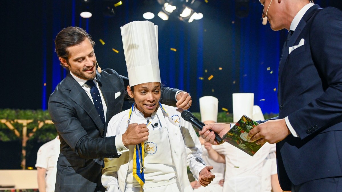 . Jessie Sommarström får sin medalj av prins Carl Philip. Jessie Sommarström 43 vinner Årets kock och är svensk mästare i professionell. Menyn för lunch komponerades av Johan Backeus vinnare Årets Kock 2017 och Birgit Malmcrona.